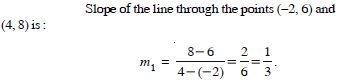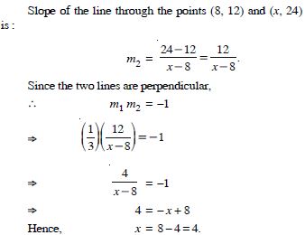 Line through the points (–2, 6) and (4, 8) is perpendicular to the line through the points (8, 12) and (x, 24). Find the value of ‘x’.