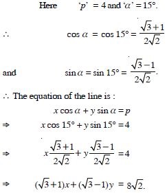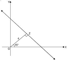 Find the equation of the line whose perpendicular distance from the origin is 4 units and the angle which the normal makes with positive direction of x-axis is 15.
