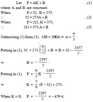 The Fahrenheit temperature F and absolute temperature K satisfy a linear equation. Given K = 273 when F = 32 and that K = 373 when F = 212. Express K in terms of F and the value of F when K = 0.