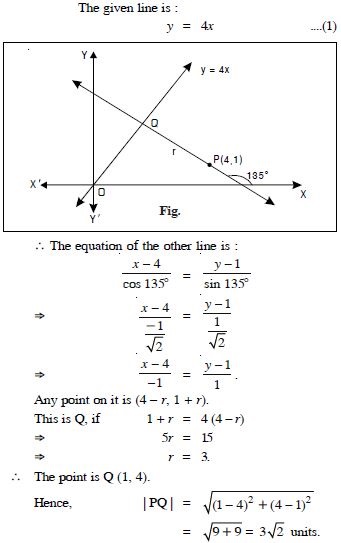 Find the distance of the line 4x – y = 0 from the point P(4, 1) measured along the line making an angle of 135 with the positive x-axis.