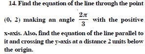 The “Straight Lines” chapter of Maths Class 11 teaches general equation of a line, slope of a line, the distance of a point from a line, various forms of equations of a line: slope-intercept form, normal form, parallel to axes, intercepts form, point-slope form, two-point form; the angle between two lines, and much more.