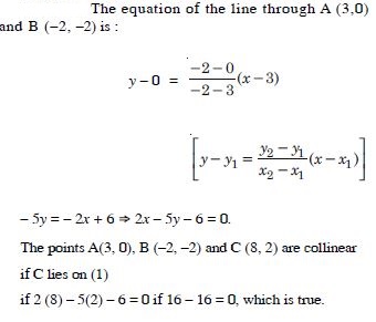 By using the concept of the equation of a line, prove that three points (3, 0), (–2, –2) and (8, 2) are collinear.
