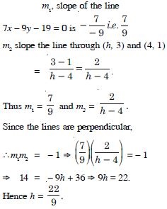 The line through the points (h, 3) and (4, 1) intersects the line 7x – 9y – 19 = 0 at right angle. Find the value of h.