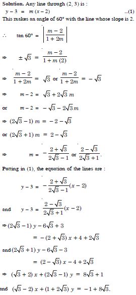 Two lines passing through the point (2, 3) intersect each other at an angle of 60°. If the slope of one line is 2, find the equation of the other line