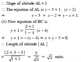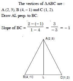 In the triangle ABC with vertices A (2, 3), B (4, – 1) and C (1, 2), find the equation and length of altitude from the vertex A.