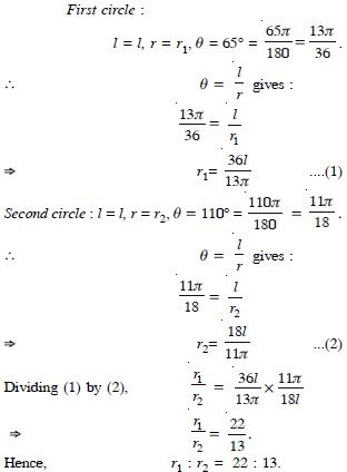 If the arcs of the same length in two circles subtend angles 65 and 110 at the centre, find the ratio of their radii.