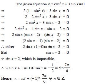 Solve : 2 cos2 x + 3 sin x = 0.