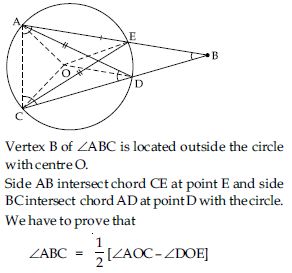 Let vertex of an angle ABC be located outside a circle and let the sides of the angle intersect equal chords AD and CE with the circle. Prove that ∠ABC is equal to half the difference of the angles subtended by the chords AC and DE at the centre.