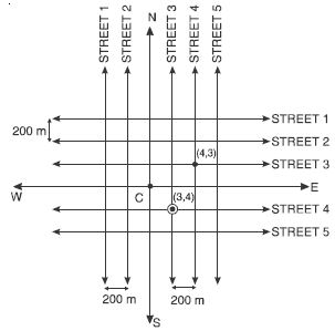 To reach at cross-street referred as (4, 3); we choose 4th street running in the North-South