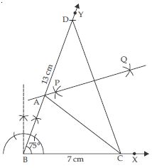 3. With B as centre and radius = 13 cm (_ AB + AC = 13 cm) draw an arc to meet BY at D.