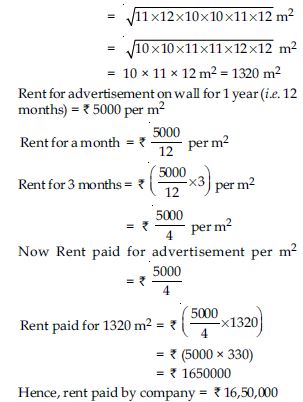 The triangular side walls of a flyover has been used for advertisements. The sides of the walls are 122 m, 22 m and 120 m (see fig.). The advertisement yield an earning of ` 5000 per m2 per year. A company hired one of its walls for 3 months. How much rent did it pay?