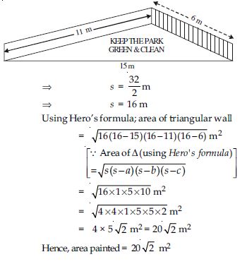 There is slide in a park. One of its side walls has been painted in some colour with a message ‘‘KEEP THE PARK GREEN AND CLEAN’’, (See Fig.). If the sides of the wall are 15 m, 11 m and 6 m, find the area painted in colour.