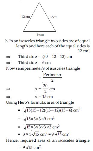 An isosceles triangle has perimeter 30 cm and each of the equal sides is 12cm. Find the area of the triangle.