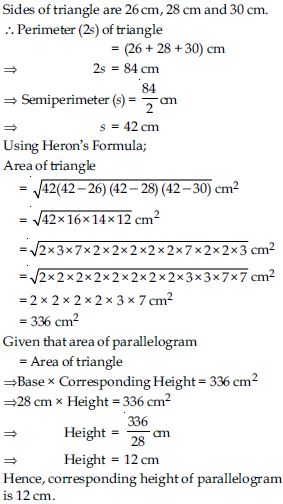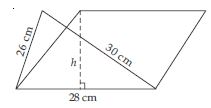 A triangle and a parallelogram have the same base and the same area. If the sides of the triangle are 26 cm, 28 cm and 30 cm, and the parallelogram stands on the base 28cm, find the height of the parallelogram.