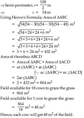 A rhombus shaped field has green grass for 18 cows to graze. If each side of the rhombus is 30 m and its longer diagonal is 48 m, grass of how much area of grass field will each cow be getting?