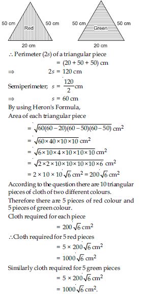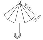 An umbrella is made by stitching 10 triangular pieces of cloth of two different colours (See Fig.) each piece measuring 20 cm, 50 cm and 50 cm. How much cloth of each colour is required for the umbrella?