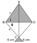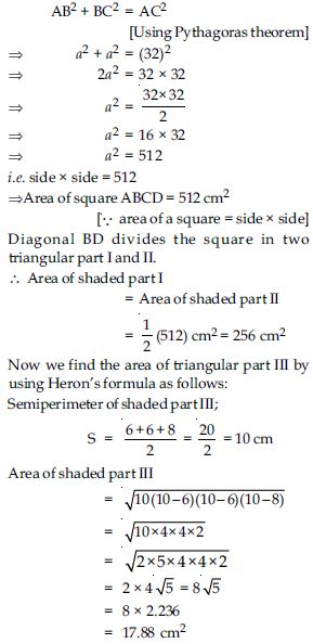 A kite is in the shape of a square with a diagonal 32 cm and an isosceles triangle of base 8 cm and sides 6 cm each is to be made of three different shades as shown in fig.