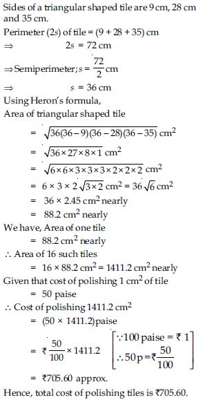 A floral design on a floor is made up of 16 tiles which are triangular, the sides of the triangle being 9 cm, 28 cm and 35 cm (See Fig.). Find the cost of polishing the tiles at the rate of 50 p per cm2.