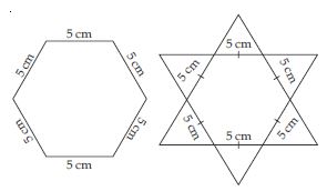 Complete the hexagonal and star shaped Rangolies (see figs.) by filling them with as many equilateral triangles of side 1 cm as you can. Count the number of triangles in each case. Which has more triangles?