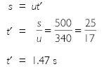 Time taken, t = 1.02 s; v = 1,531 ms-1.