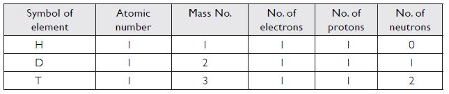 For the symbol H, D and T, tabulate three sub-atomic particles found in each of them.