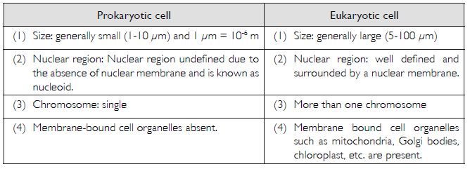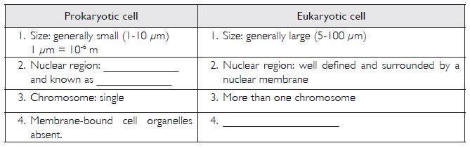 Fill in the gaps in the following table illustrating differences between prokaryotic and eukaryotic cells.