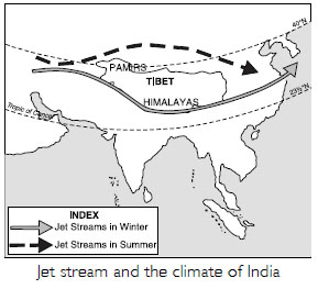 Jet streams are fast flowing winds blowing in a narrow zone in the upper atmosphere. The Himalayas divide the jet streams into two parts. The westerly jet streams (27–30º N) blows over the south of the Himalayas during the winter season. The easterly jet streams develop at about 14N in summer. It is believed to be responsible for the sudden outbreak of monsoons in Northern India. It causes widespread storms, thunder and rainfall over India in just 8 to 10 days.