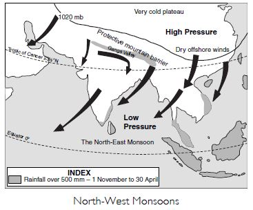 subcontinent, the mountain barriers to the north guide the flow of the monsoon winds. The