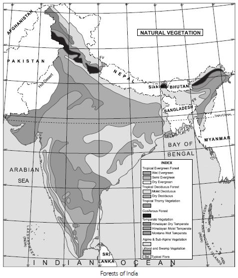 Types of Forests: Due to variation in rainfall, temperature and altitude, there is great variety of natural vegetation in India. The following different types of forests are found in India: