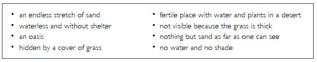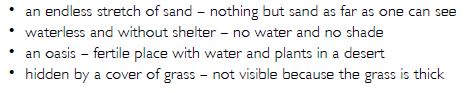 The following two phrases describe the desert as most people see it: (a) an endless stretch of sand, (b) dry, hot, waterless land and without shelter.