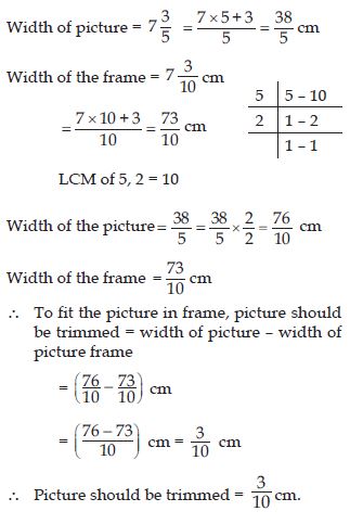Salil wants to put a picture in the frame. The picture is 7 ⅗ cm wide. To fit in the frame the picture cannot be more than 7 3/10 cm wide. How much should the picture be trimmed?