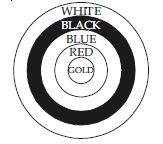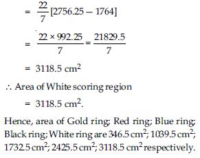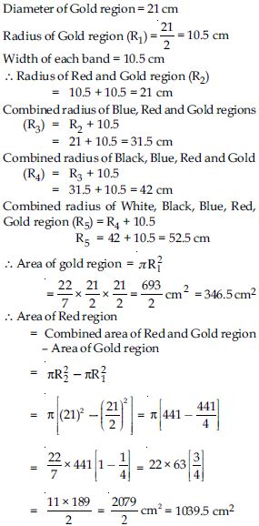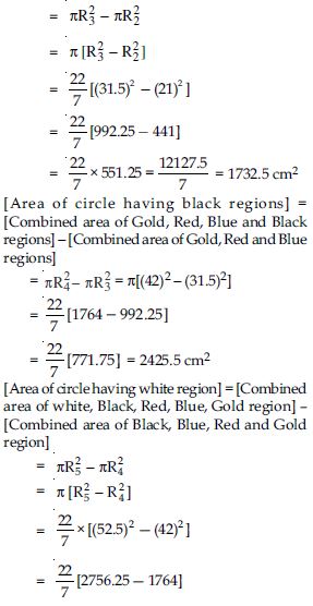 Fig., depicts an archery target marked with its five scoring regions from the centre outwards as Gold, Red, Blue, Black and White. The diameter of the region representing Gold score is 21 cm and each of the other bands is 10.5 cm wide. Find the area of each of the five scoring regions.