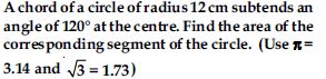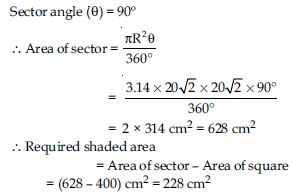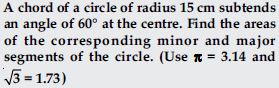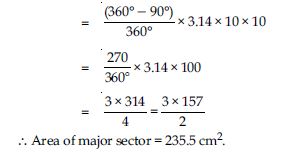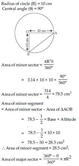 A chord of a circle of radius 10 cm subtends a right angle at the centre. Find the area of the corresponding: (i) minor segment (ii) major sector. (Use = 3.14)