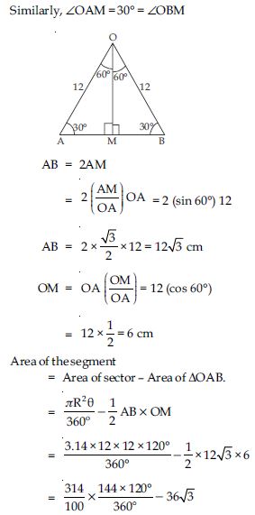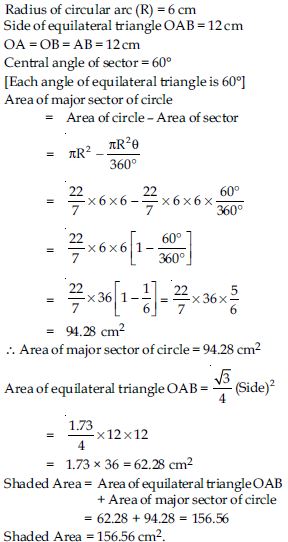 Find the area of the shaded region in fig., where a circular arc of radius 6 cm has been drawn with vertex O of an equilateral triangle OAB of side 12 cm as centre.