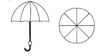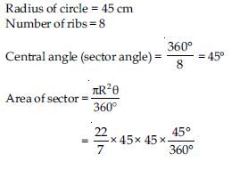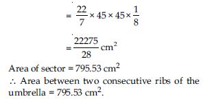 An umbrella has 8 ribs which are equally spaced (see fig.). Assuming umbrella to be a flat circle of radius 45 cm, find the area between the two consecutive ribs of the umbrella.