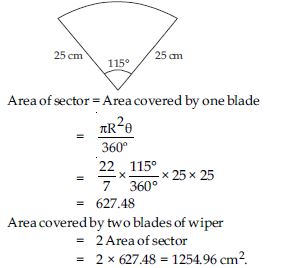 A car has two wipers which do not overlap. Each wiper has a blade of length 25 cm sweeping through an angle of 115. Find the total area cleaned at each sweep of the blades.