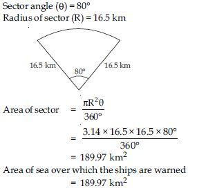 To warn ships for underwater rocks, a lighthouse spreads a red coloured light over a sector of angle 80 to a distance of 16.5 km. Find the area of the sea over which the ships are warned. (Use = 3.14)