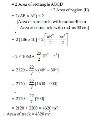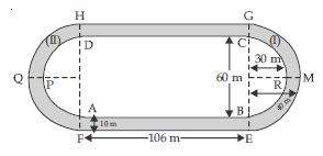 The distance between the two inner parallel line segments is 60 m and they are each 106 m long. If the track is 10 m wide, find: