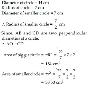 In fig., AB and CD are two diameters of a circle (with centre O) perpendicular to each other and OD is the diameter of the smaller circle. If OA = 7 cm, find the area of the shaded region.
