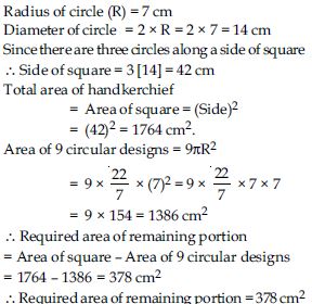 On a square handkerchief, nine circular designs each of radius 7 cm are made (see fig.). Find the area of the remaining portion of the handkerchief.