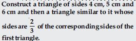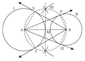 Draw a line segment AB of length 8 cm. Taking A as centre, draw a circle of radius 4 cm and taking B as centre, draw another circle of radius 3 cm. Construct tangents to each circle from the centre of the other circle.