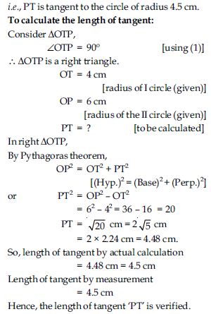 Construct a tangent to a circle of radius 4 cm from a point on the concentric circle of radius 6 cm and measure its length. Also verify the measurement by actual calculation.