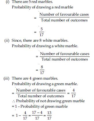 A box contains 5 red marbles, 8 white marbles and 4 green marbles. One marble is taken out of the box at random. What is the probability that the marble taken out will be (i) red? (ii) white? (iii) not green?