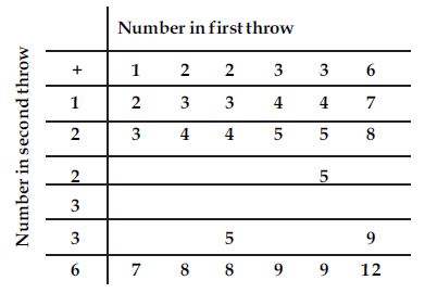 A die is numbered in such a way that its faces show the numbers 1, 2, 2, 3, 3, 6. It is thrown two times and the total score in two throws is noted. Complete the following table which gives a few values of the total score on the two throws: