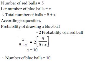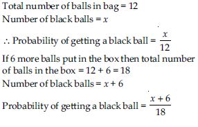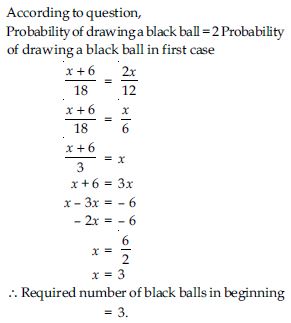 A box contains 12 balls out of which x are black. If one ball is drawn at random from the box, what is the probability that it will be a black ball? If 6 more black balls are put in the box, the probability of drawing a black ball is now double of what it was before. Find x.