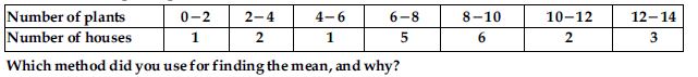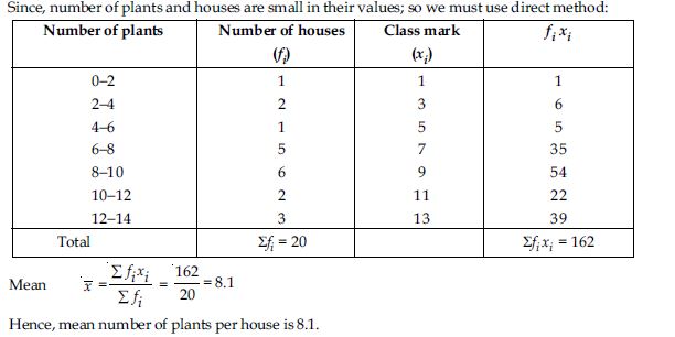 A survey was conducted by a group of students as a part of their environment awareness programme, in which they collected the following data regarding the number of plants in 20 houses in a locality. Find the mean number of plants per house.