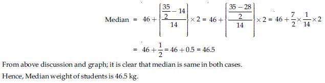 Draw a less than type ogive for the given data. Hence obtain the median weight from the graph and verify the result by using the formula.