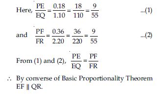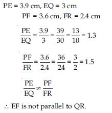 E and F are points on the sides PQ and PR respectively of a PQR. For each of the following cases, state whether EF || QR: PQ = 1.28 cm, PR = 2.56 cm, PE = 0.18 cm and PF = 0.36 cm