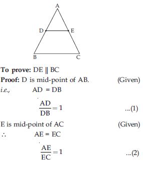 Given: ABC, D and E are mid-points of AB and AC respectively such that AD = DB and AE = EC, D and E are joined.