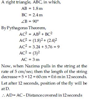 Nazima is fly fishing in a stream. The tip of her fishing rod is 1.8 m above the surface of the water and the fly at the end of the string rests on the water 3.6 m away and 2.4 m from a point directly under the tip of the rod. Assuming that her string (from the tip of her rod to the fly) is taut, how much string does she have out? If she pulls in the string at the rate of 5 cm per second, what will the horizontal distance of the fly from her after 12 seconds?